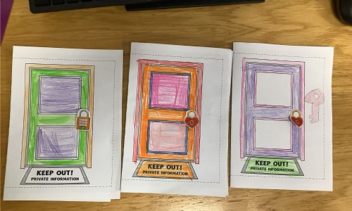 The children sorted information into two groups: safe to share (such as favourite colour or hobbies) and keep private (such as full name, home address and passwords). They then designed their own privacy doors with locks and safety messages.