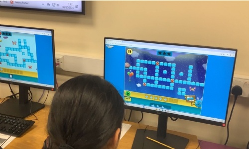 The children worked through different levels on the computer, carefully arranging their coding blocks so their fuzzy character could reach the goal. Sometimes, if one block was in the wrong place, the program didn’t work – so they had to test, debug and try again.
