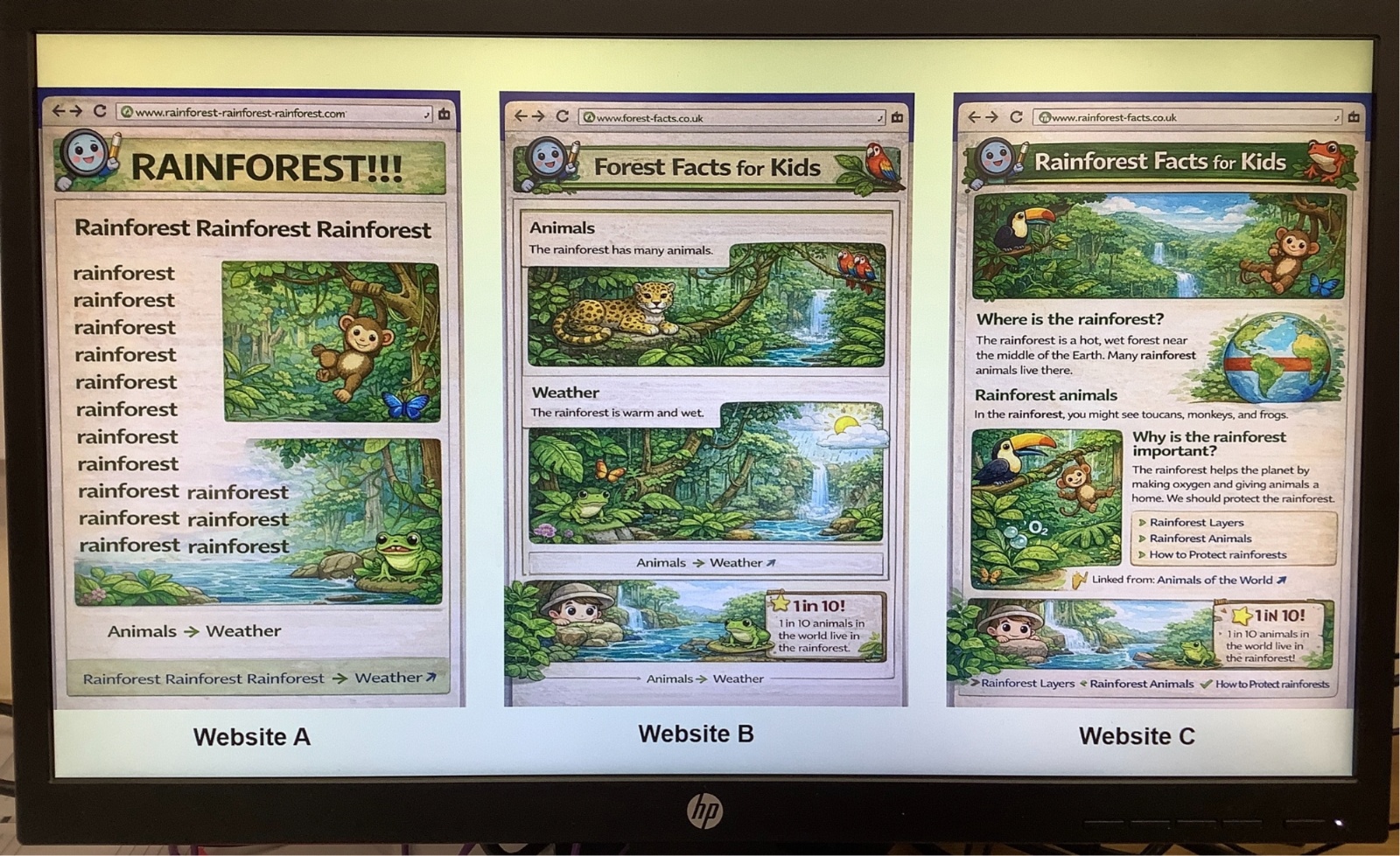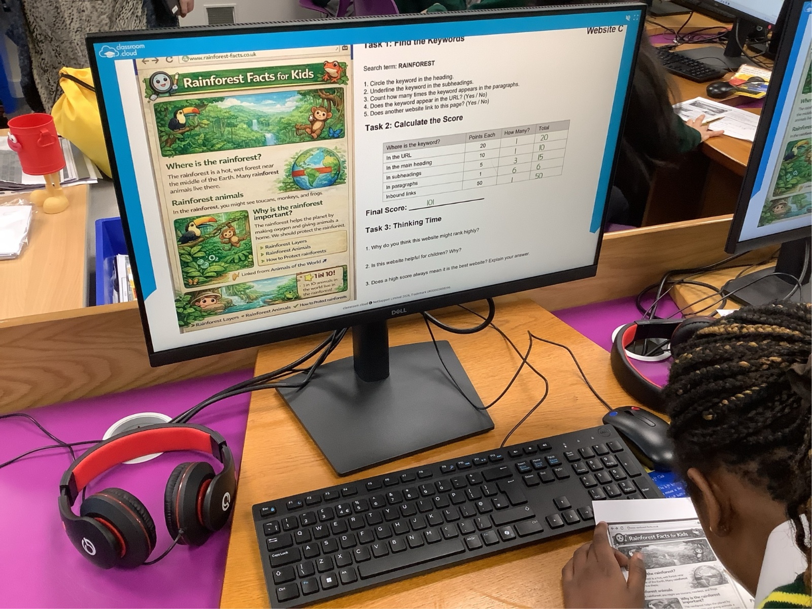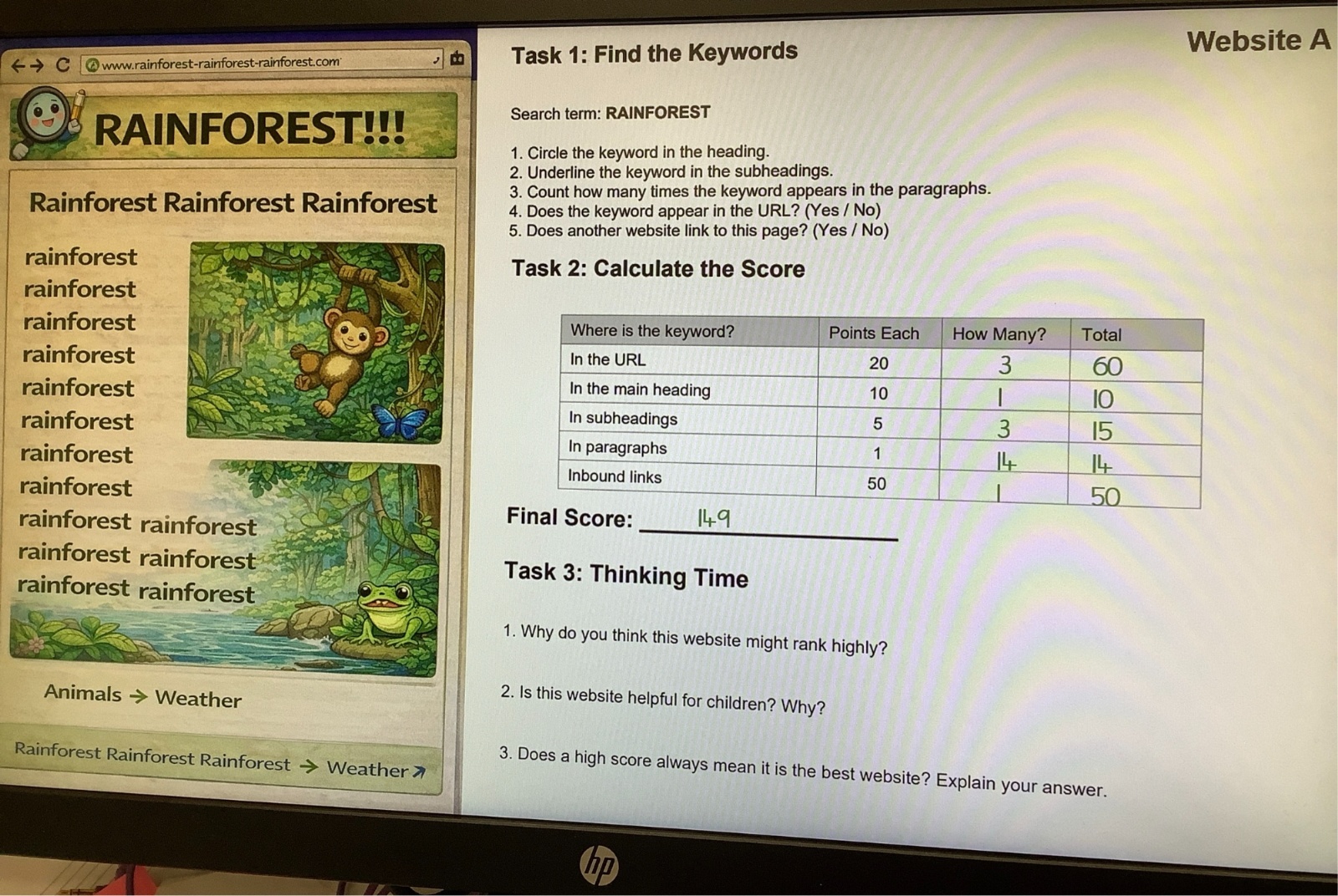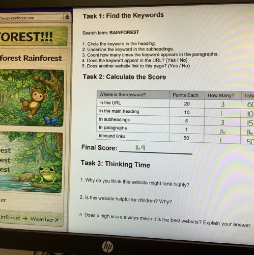 Using the search term “rainforest”, pupils ranked three different websites and discussed why some appeared higher than others. They discovered that: