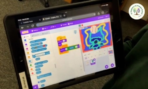 Using the microphone as an input, the children programmed their sprites to react to different sound levels. Louder sounds created bigger visual changes, bringing their designs to life in real time.