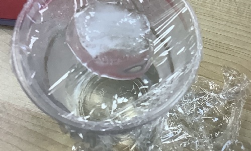 Then we put an ice cube on top of the cling film to turn the water vapours into water droplets. This is condensation.