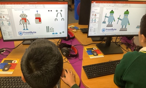 In Computing, Year 5 became robot designers for a magical winter tech company called FrostByte Industries! 🤖❄️
