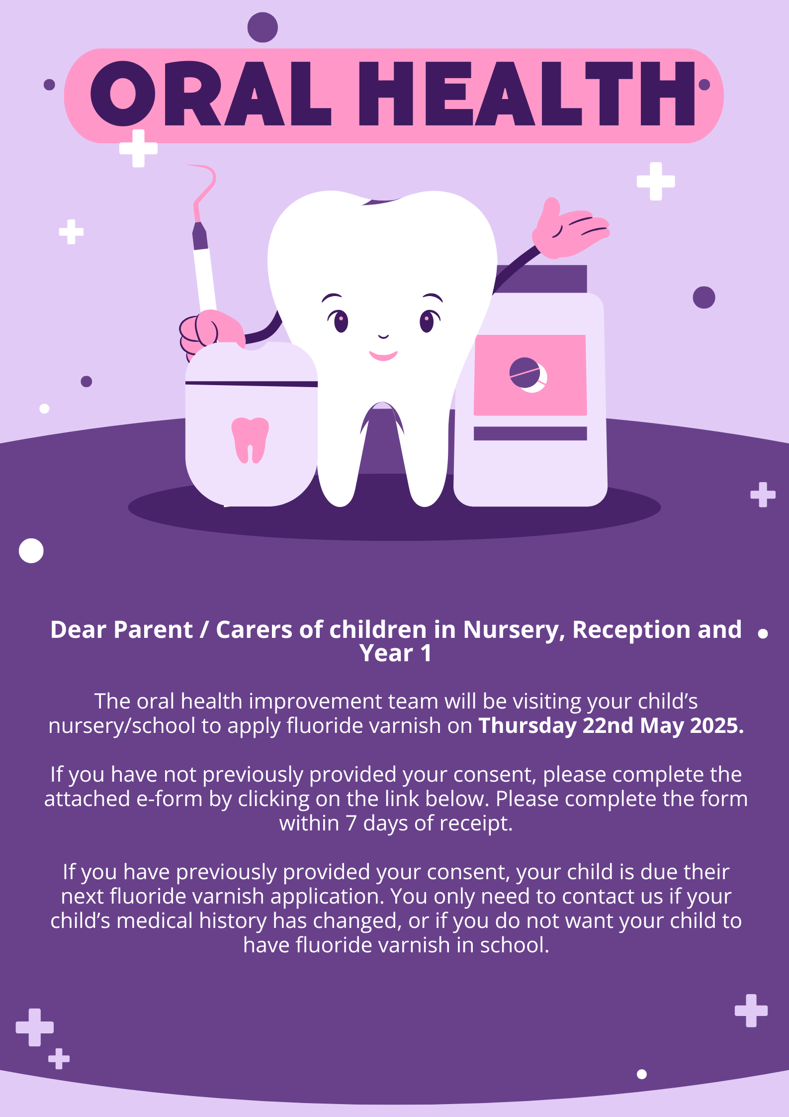 The oral health improvement team will be visiting your child’s nursery/school to apply fluoride varnish on Thursday 22nd May 2025.