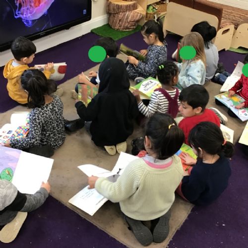 In Nursery, we put some nice calming music on the screen and read for pleasure on the carpet and reading area. We have really enjoyed it!