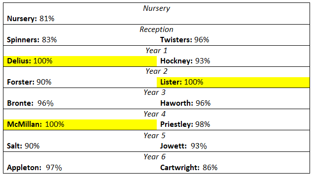 It has been wonderful to see everyone back after the holidays. Attendance has been very good this week with 3 classes achieving 100% - amazing! Thank you so much for ensuring the children get to school each day on time.