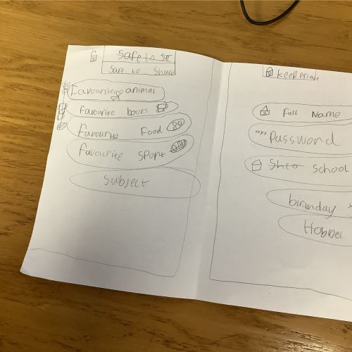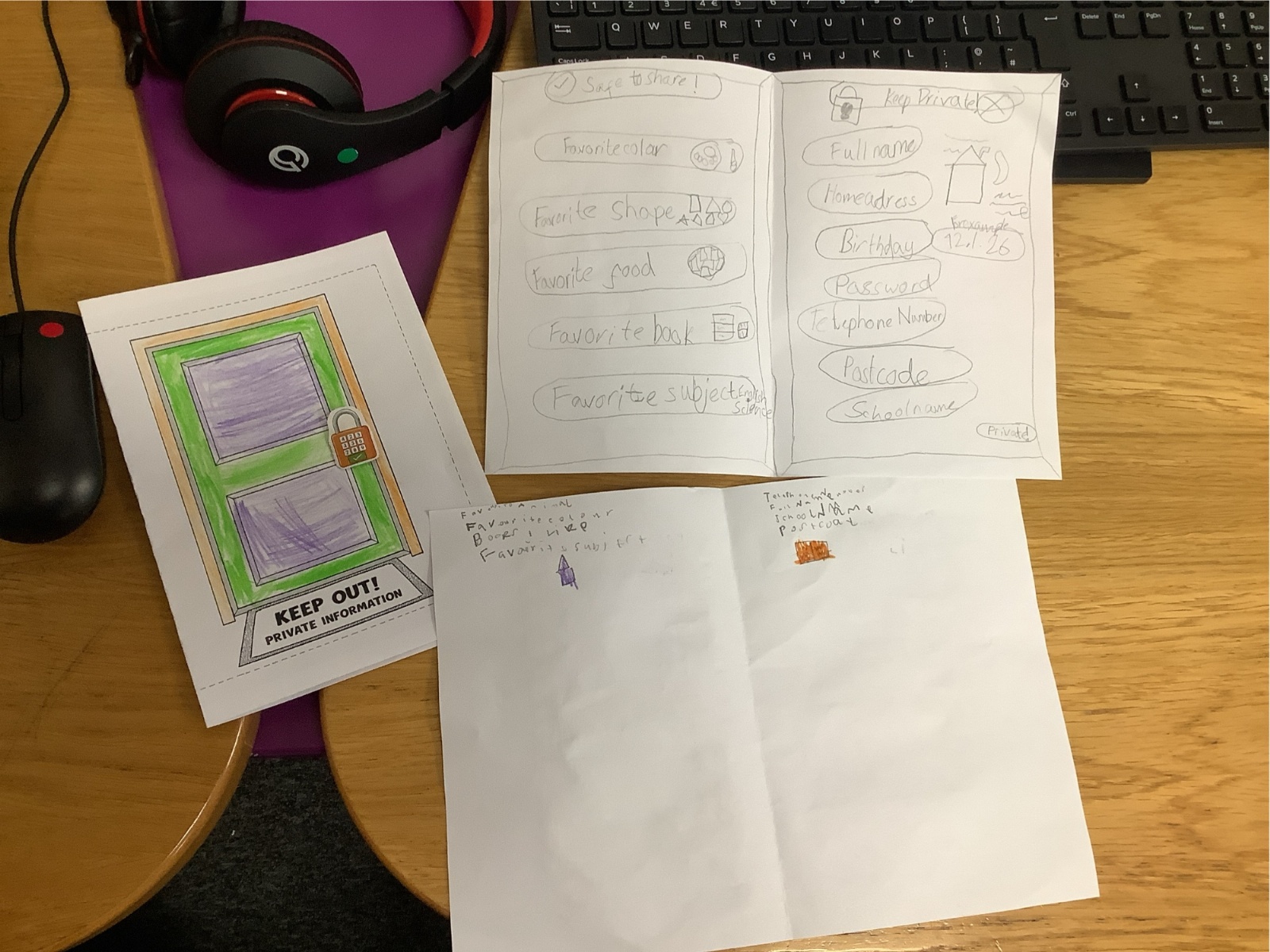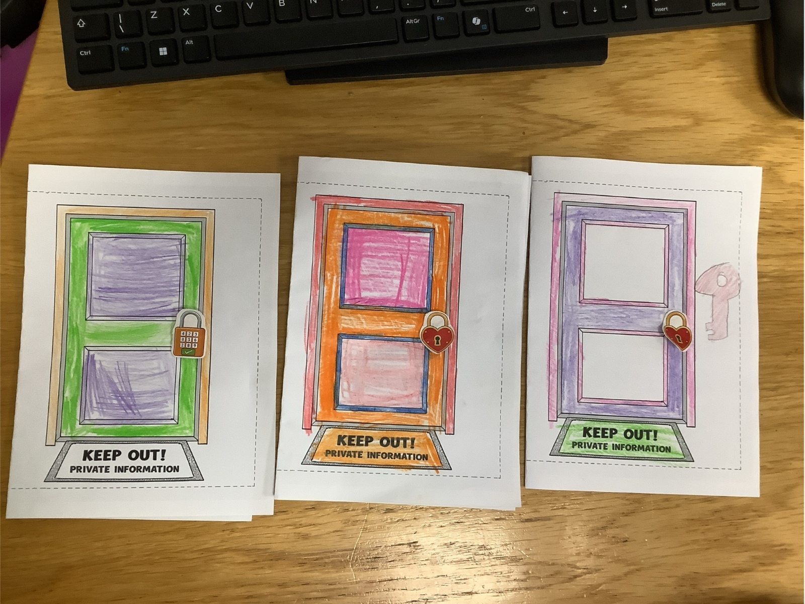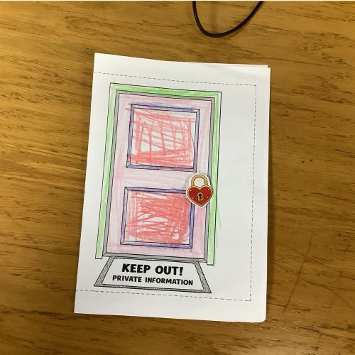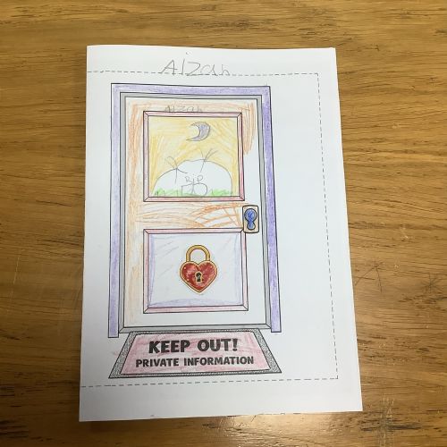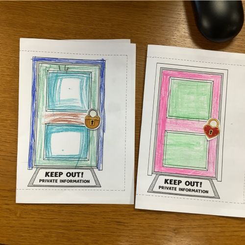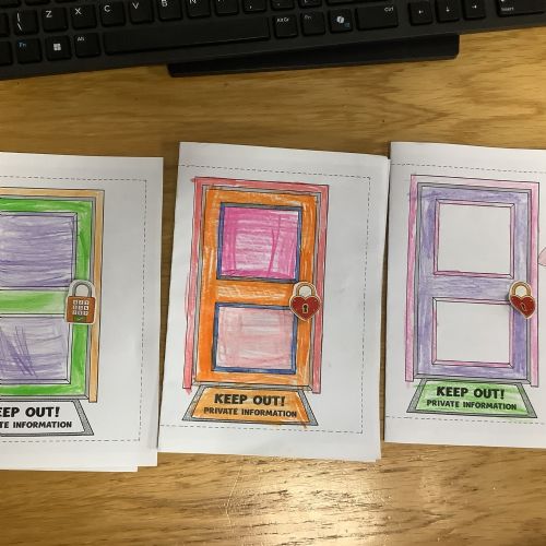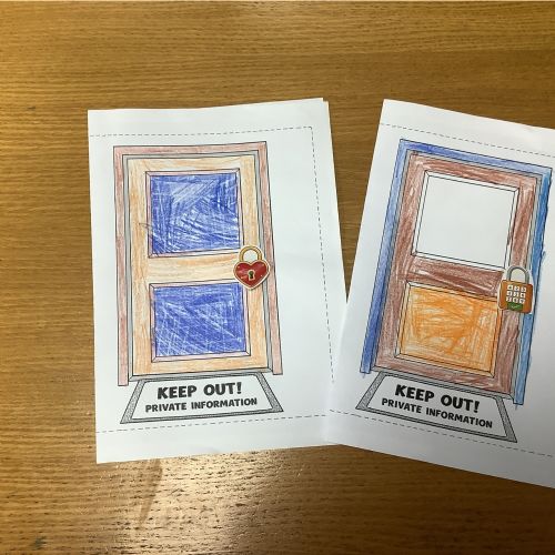 The children sorted information into two groups: safe to share (such as favourite colour or hobbies) and keep private (such as full name, home address and passwords). They then designed their own privacy doors with locks and safety messages.