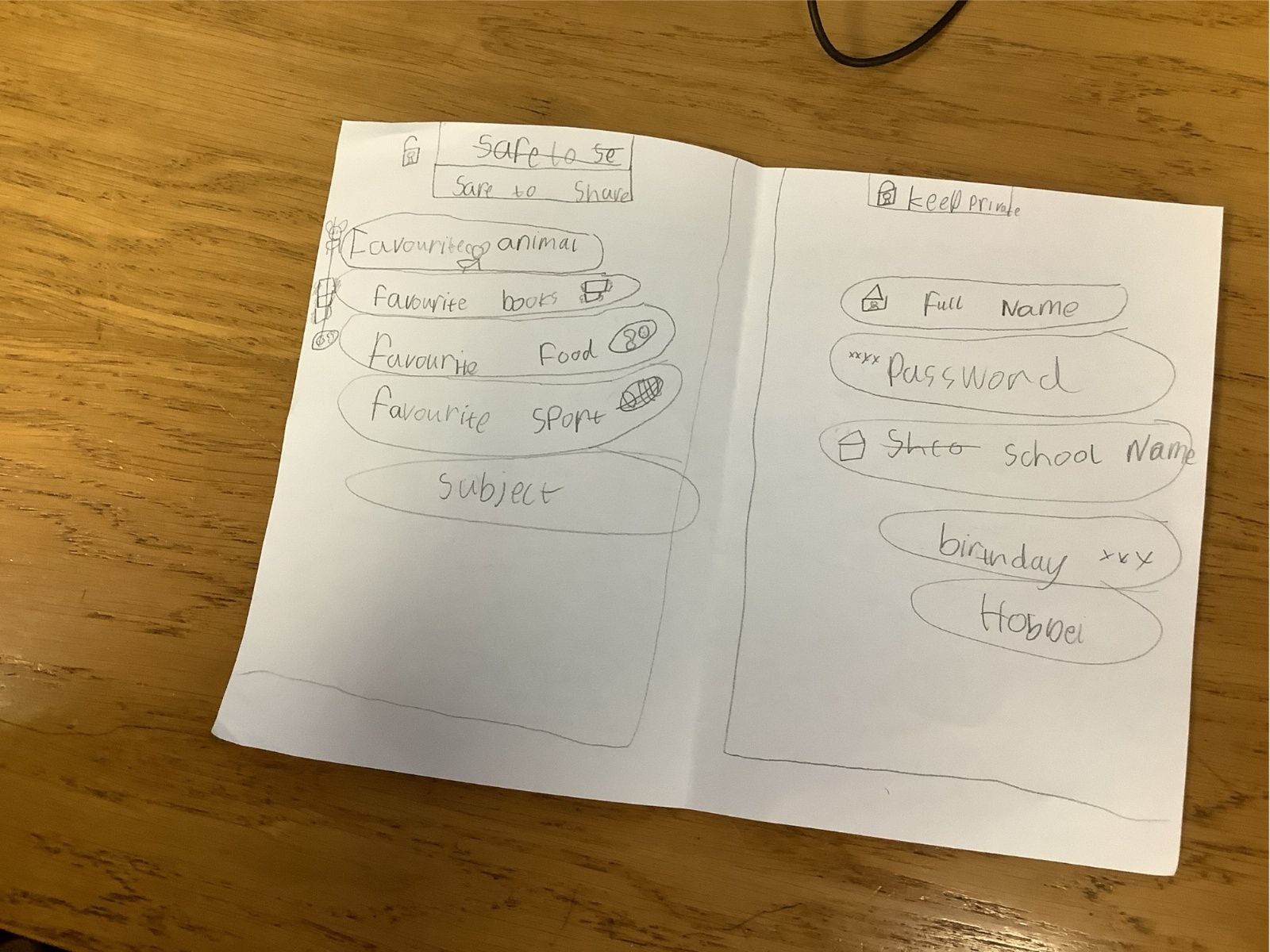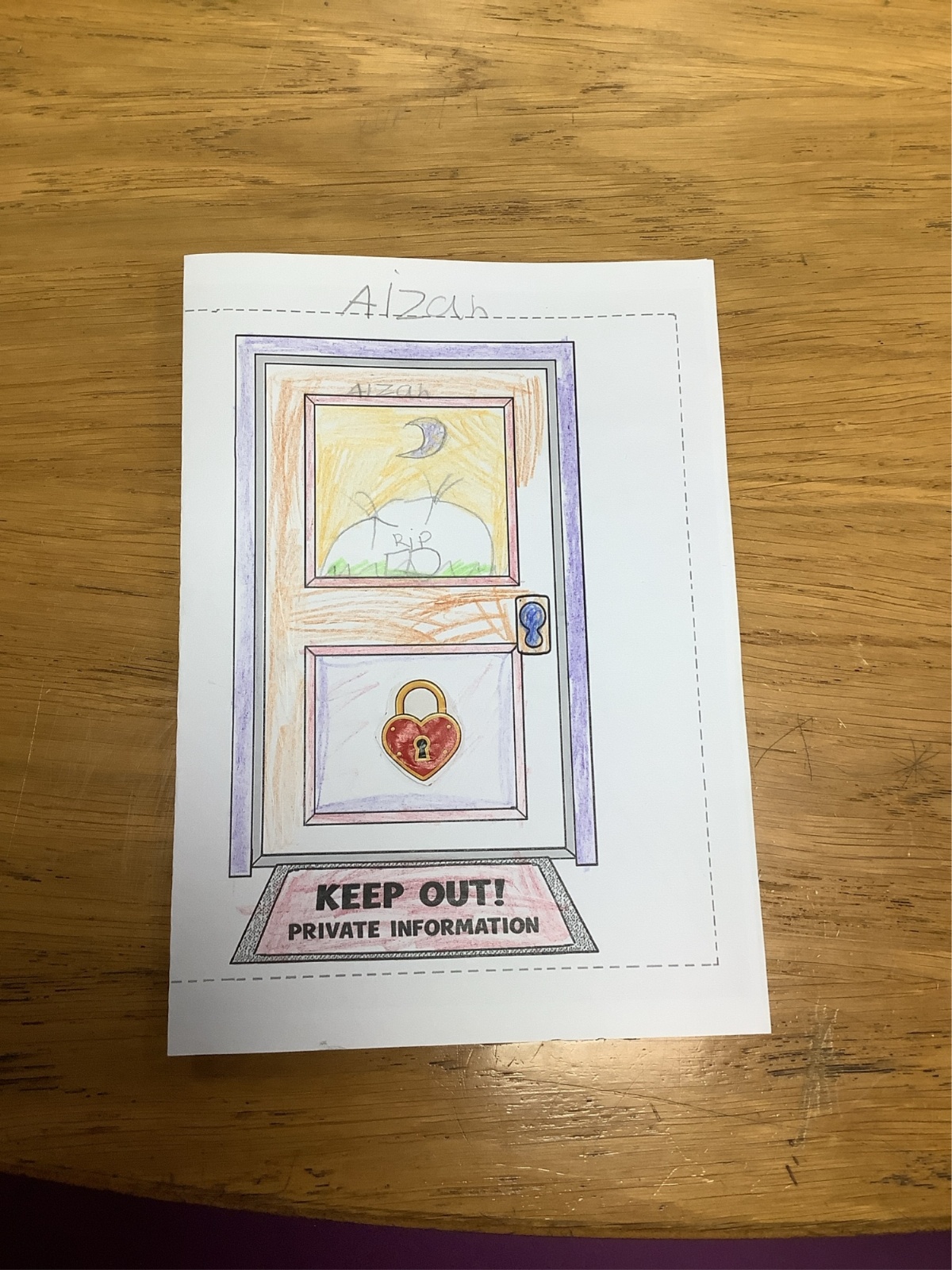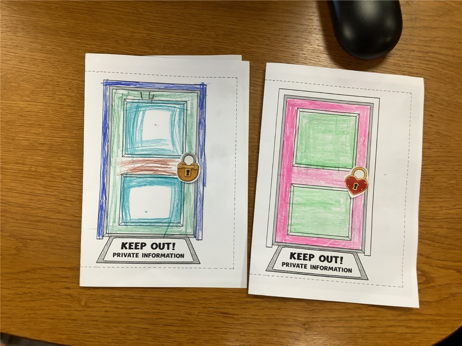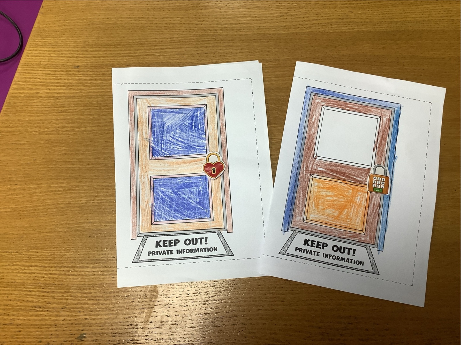 The children sorted information into two groups: safe to share (such as favourite colour or hobbies) and keep private (such as full name, home address and passwords). They then designed their own privacy doors with locks and safety messages.