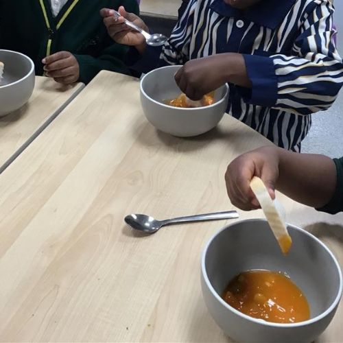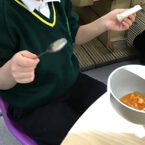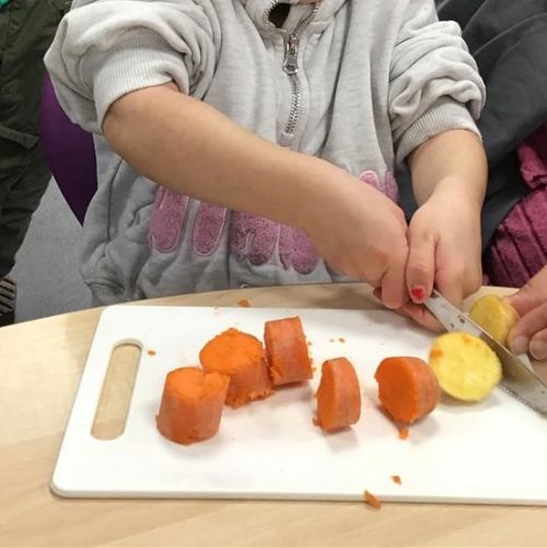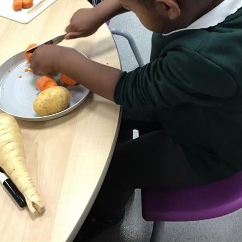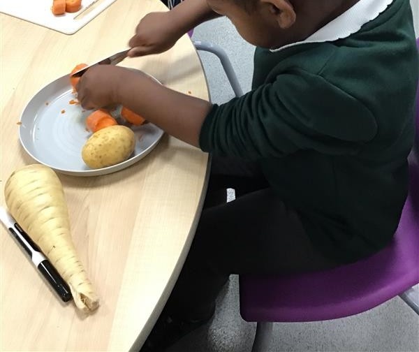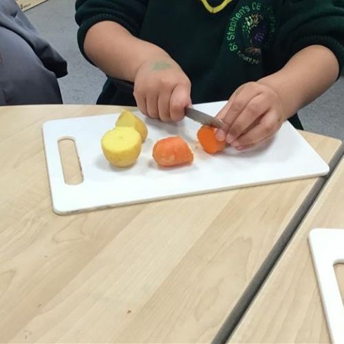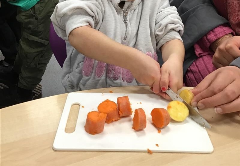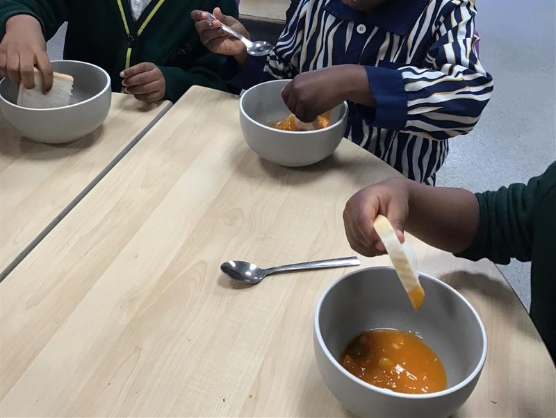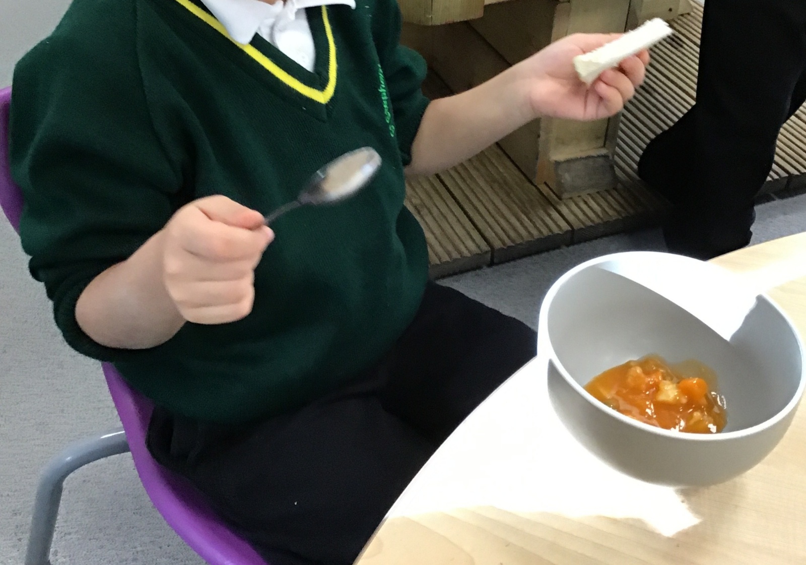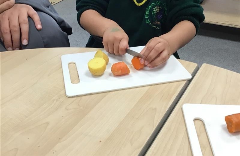 This week our children have shown interest in things that grow outside. The children were shocked to find out that some of our favourite vegetables also grow outside and not in a shop! We enjoyed watching Jo Jo and Gran Gran making their very own soup and our children wanted to do the same. We prepared our area, washed our hands and chopped our vegetables. We explored each vegetable using our senses and talked about where they grow. After all the hard work and preparation we sat down to enjoy our lovely hot vegetable soup!