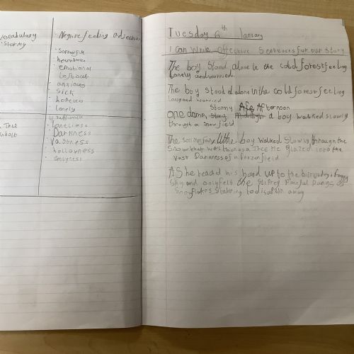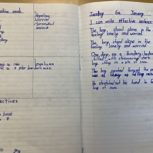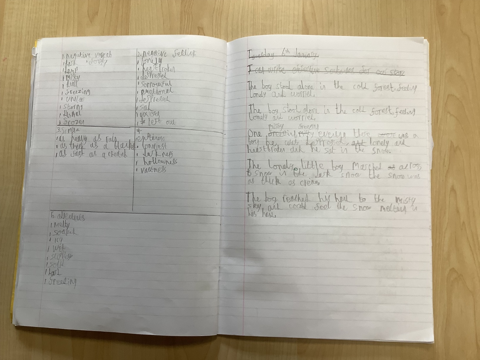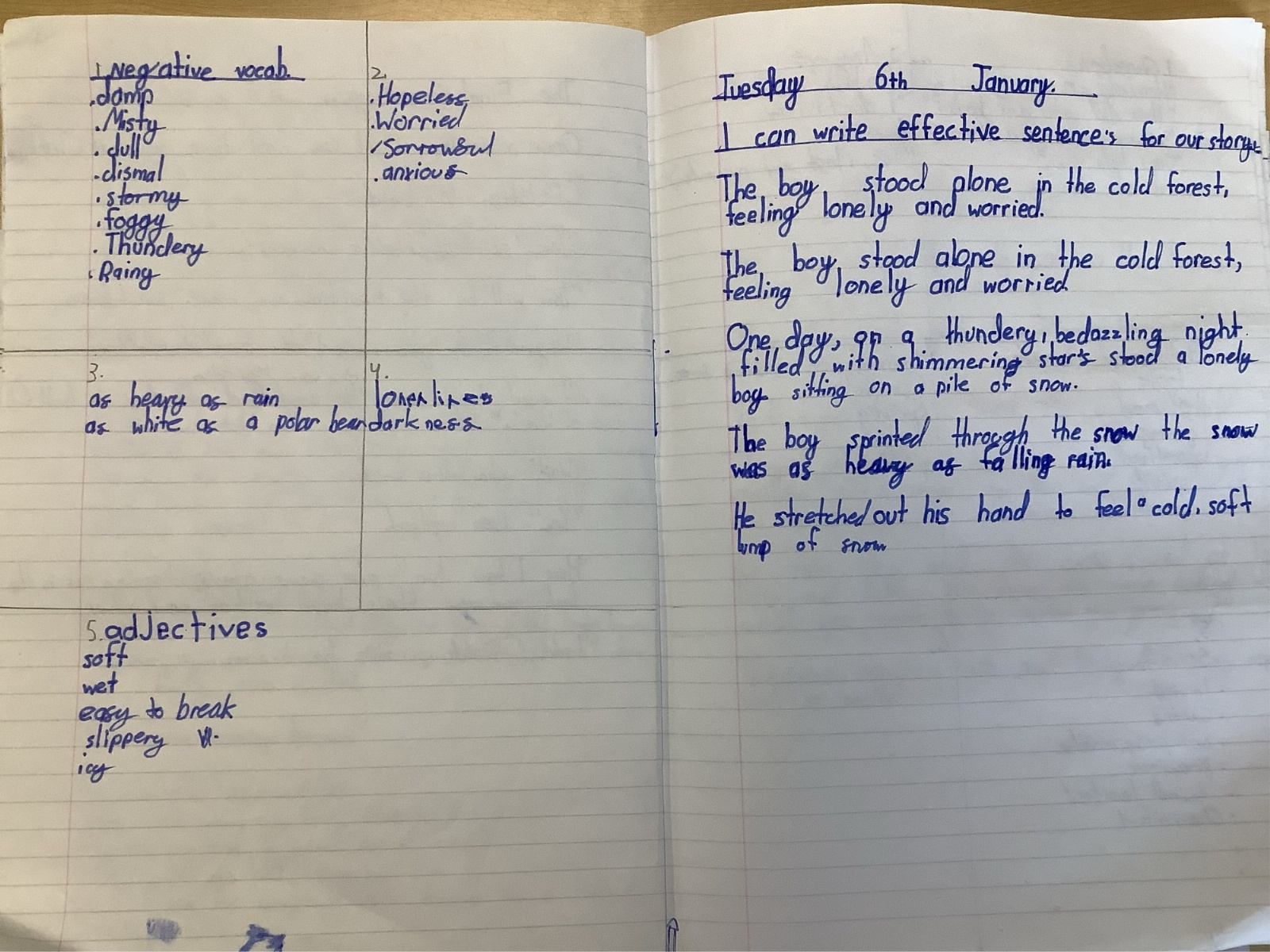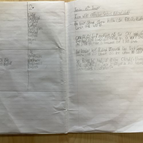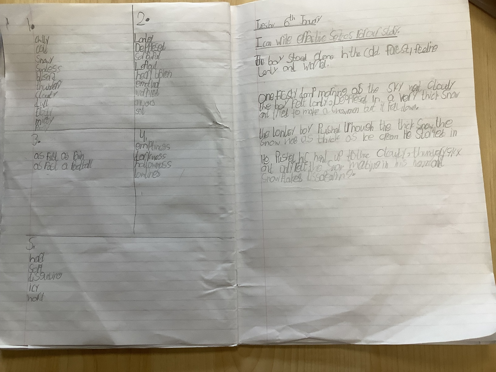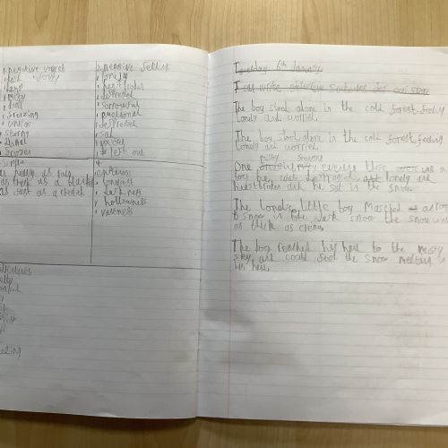 This week, we started our new book, ‘The Boy, the Mole, the Fox and the Horse’, and used the snow that fell the night before to help develop our vocabulary to describe it.